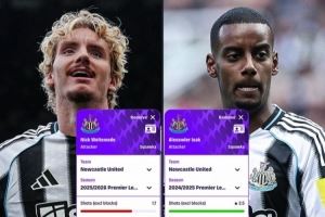 对比伊萨克上赛季,沃尔特马德英超场均进球持平且其他数据更出色